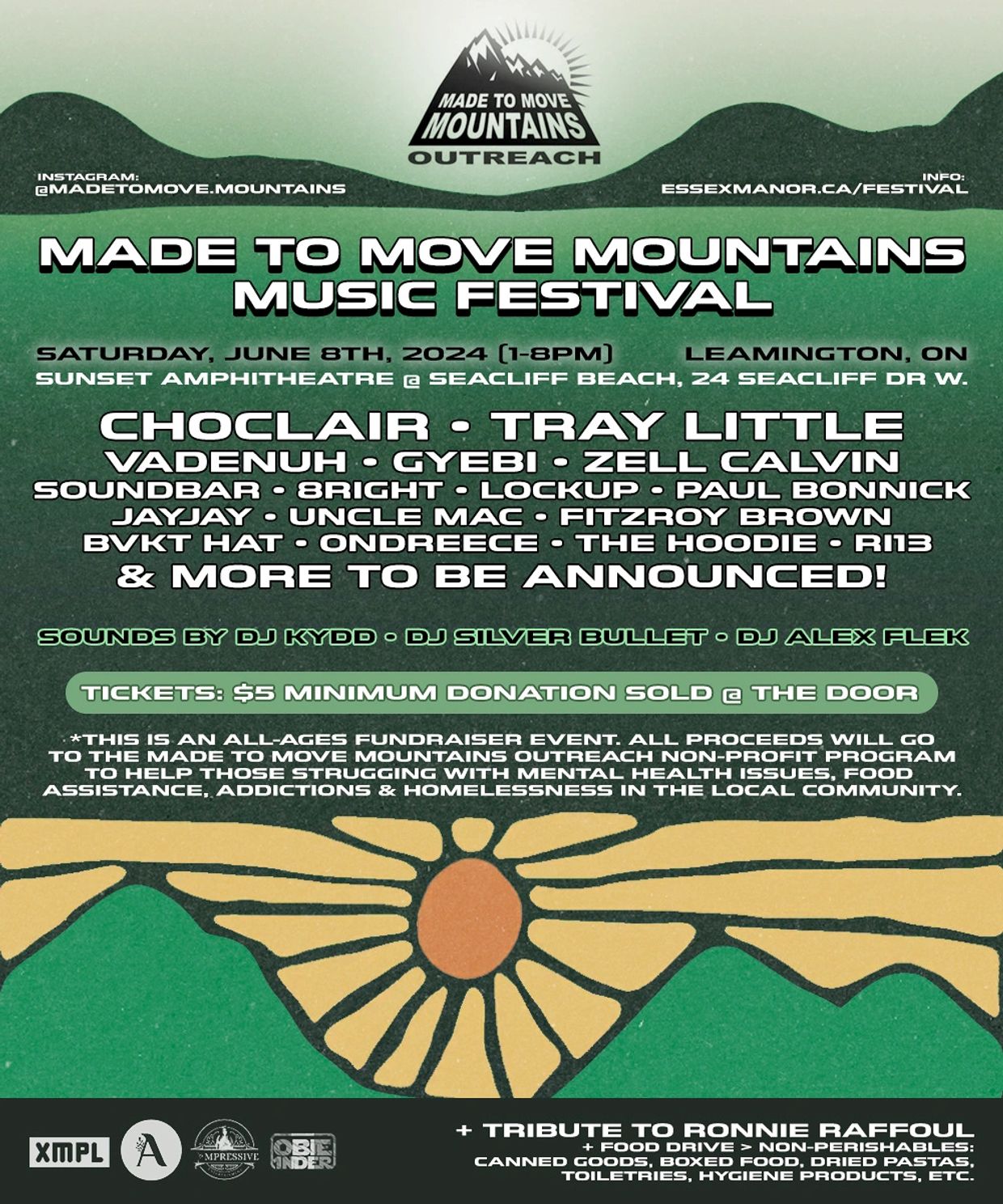 Made To Move Mountains Outreach presents: the Made To Move Mountains Music Festival – an all-ages music event that will be hosted on June 8th at the SUNSET Amphitheatre, Seacliff Beach in Leamington, ON. All proceeds will go to the Made To Move Mountains non-profit to help those struggling with mental health issues, addictions, food assistance and homelessness in the local Windsor-Essex community.